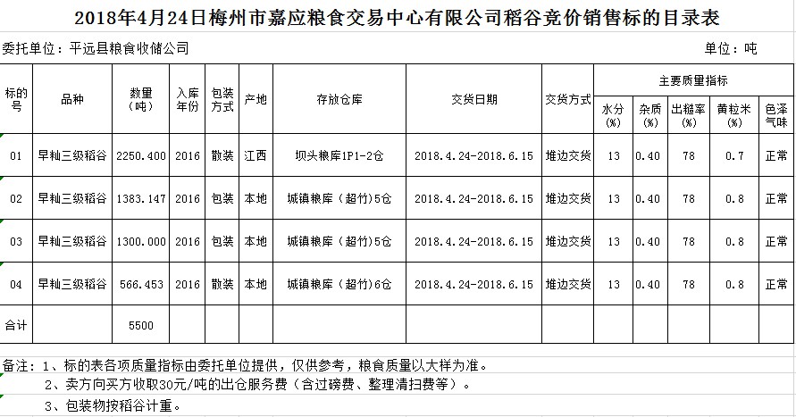 交易時間和地點:2018年4月24日(星期二)上午10時。廣東省梅州市彬芳大道南161號梅州市糧食交易中心3樓。