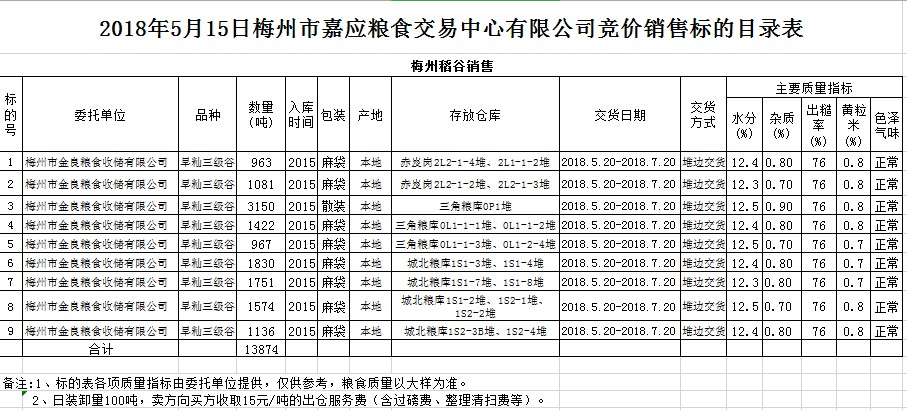 受客戶(hù)委托,梅州市嘉應(yīng)糧食交易中心有限公司定于2018年5月15日(星期二)舉辦糧食競(jìng)價(jià)交易會(huì),梅州市金良糧食收儲(chǔ)有限公司擬銷(xiāo)售早秈稻13874噸。