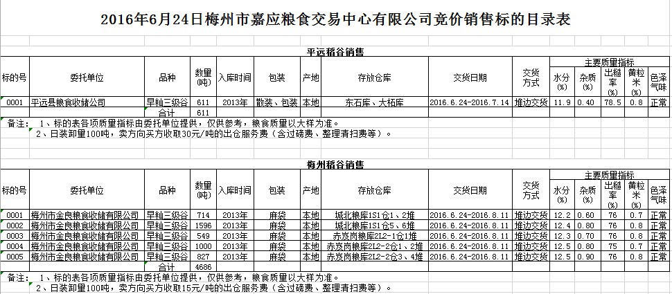 受客戶委托,梅州市嘉應(yīng)糧食交易中心有限公司定于2016年6月24日舉辦糧食競(jìng)價(jià)交易會(huì),平遠(yuǎn)縣糧食收儲(chǔ)公司擬銷售2013年早秈稻谷611噸,梅州市金良糧食收儲(chǔ)有限公司擬銷售2013年早秈稻谷4686噸。