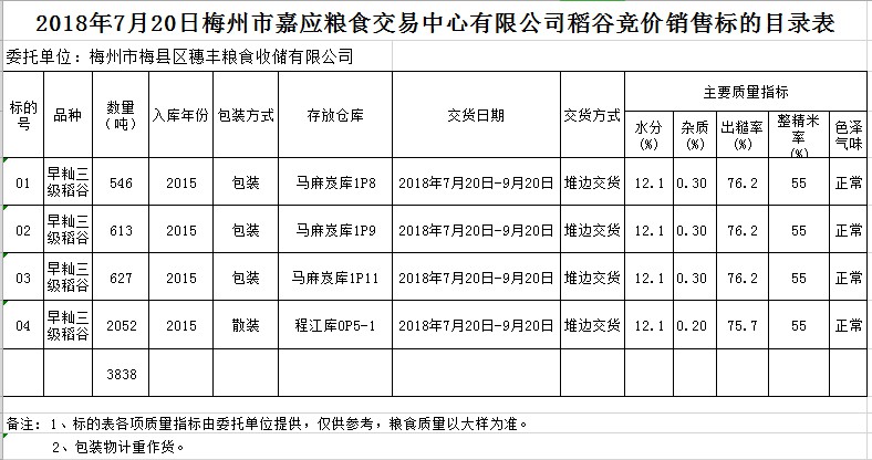受客戶委托,梅州市嘉應(yīng)糧食交易中心有限公司定于2018年7月20日(星期五)舉辦糧食競價交易會,梅州市梅縣區(qū)穗豐糧食收儲有限公司擬銷售早秈稻3838噸。