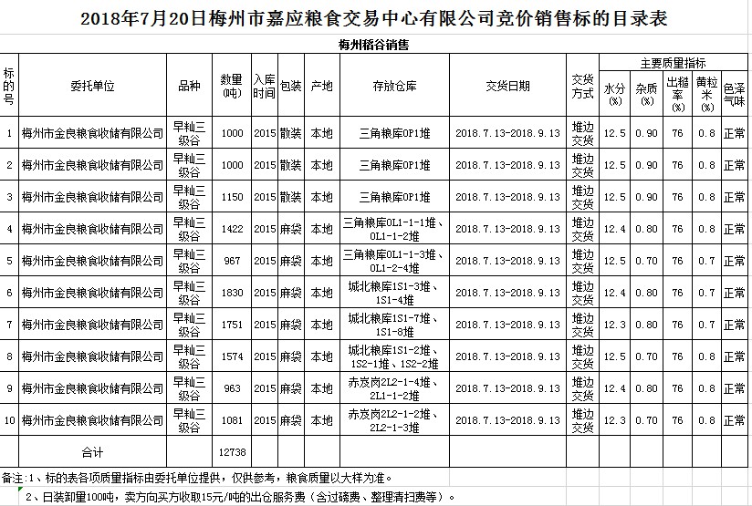 受客戶(hù)委托,梅州市嘉應(yīng)糧食交易中心有限公司定于2018年7月20日(星期五)舉辦糧食競(jìng)價(jià)交易會(huì),梅州市金良糧食收儲(chǔ)有限公司擬銷(xiāo)售早秈稻12738噸。