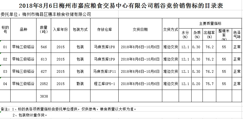 受客戶委托,梅州市嘉應糧食交易中心有限公司定于2018年8月6日(星期一)舉辦糧食競價交易會,梅州市梅縣區(qū)穗豐糧食收儲有限公司擬銷售早秈稻3838噸。